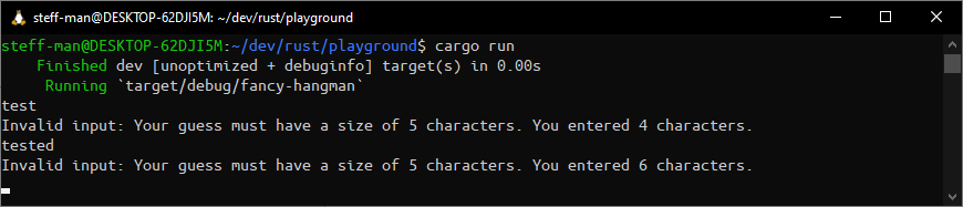 The goal is to guess a word that is 5 characters long, so the user input should match this length. The input is trimmed to remove any mishaps and newline characters. Also, we now have a condition that breaks the input loop for the program to terminate.
