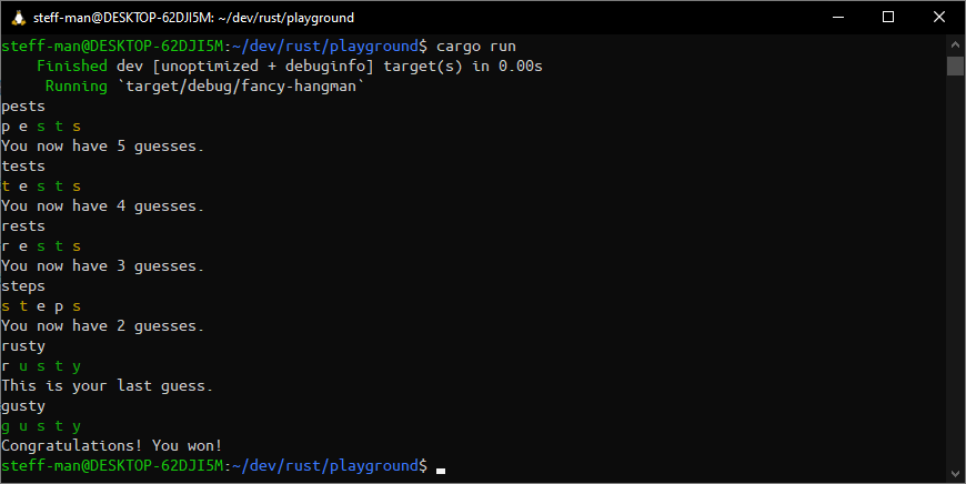 Congratulations! That’s it for the first part. We did everything on the checklist to implement a simple wordle like game that runs in the CLI. I assume hardcoding the solution just to guess it afterwards goes stale after a few seconds so be sure to don’t miss the second part where we add an external dictionary and rework how the attempts count for better player experience.