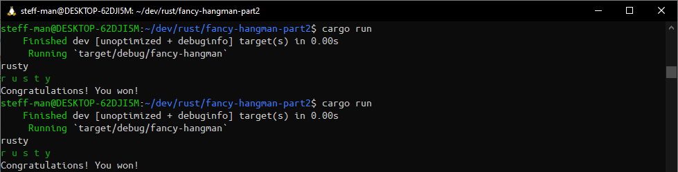 Finally, we can feast on the fruits of our work. Run cargo build and cargo run to start the game.