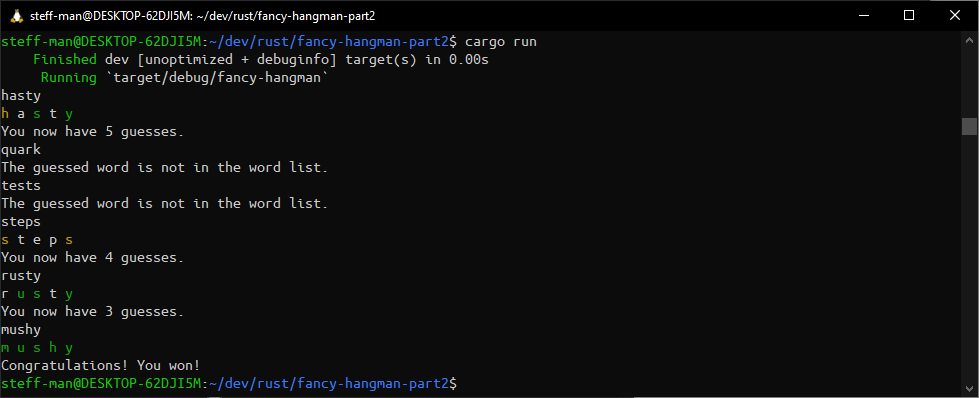 Last time we created a simple Rust CLI program that somewhat represents a wordle like game. To achieve that, we learned how to read user input from the terminal, process a String and evaluate the input against a solution. However, it would be much more interesting to have the program choose from a preferably external big pool of words instead of hardcoding the solution. For fairness, the player should also receive a message that tells him whether the word guessed in these attempts are even part of the dictionary underneath and a failed guess should not count towards his attempts.
