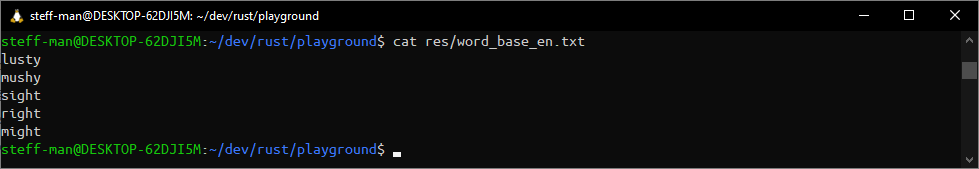 There is nothing new in this code snipped apart from the std::vec::Vec initialization with the vec! macro owning ‘static lifetime. That sounds intimidating at first, but means nothing more than creating an immutable array of immutable string slices. To make it even an inch less intimidating, it’s our five test words that won’t change.