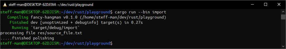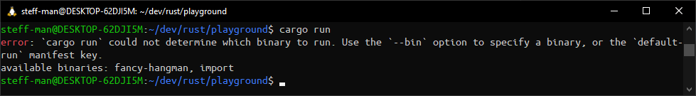 specifying it in the CLI with the commands cargo run --bin fancy-hangman and cargo run --bin import.