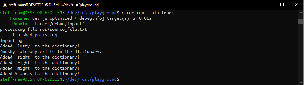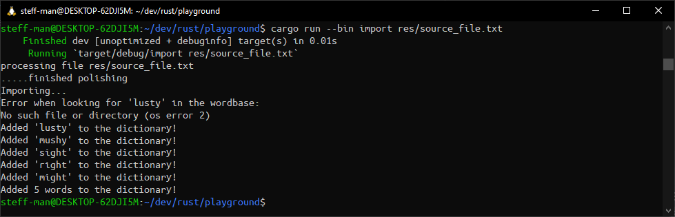 Try starting the importer with cargo run --bin import now. Remember: The create_word function implicitly calls the