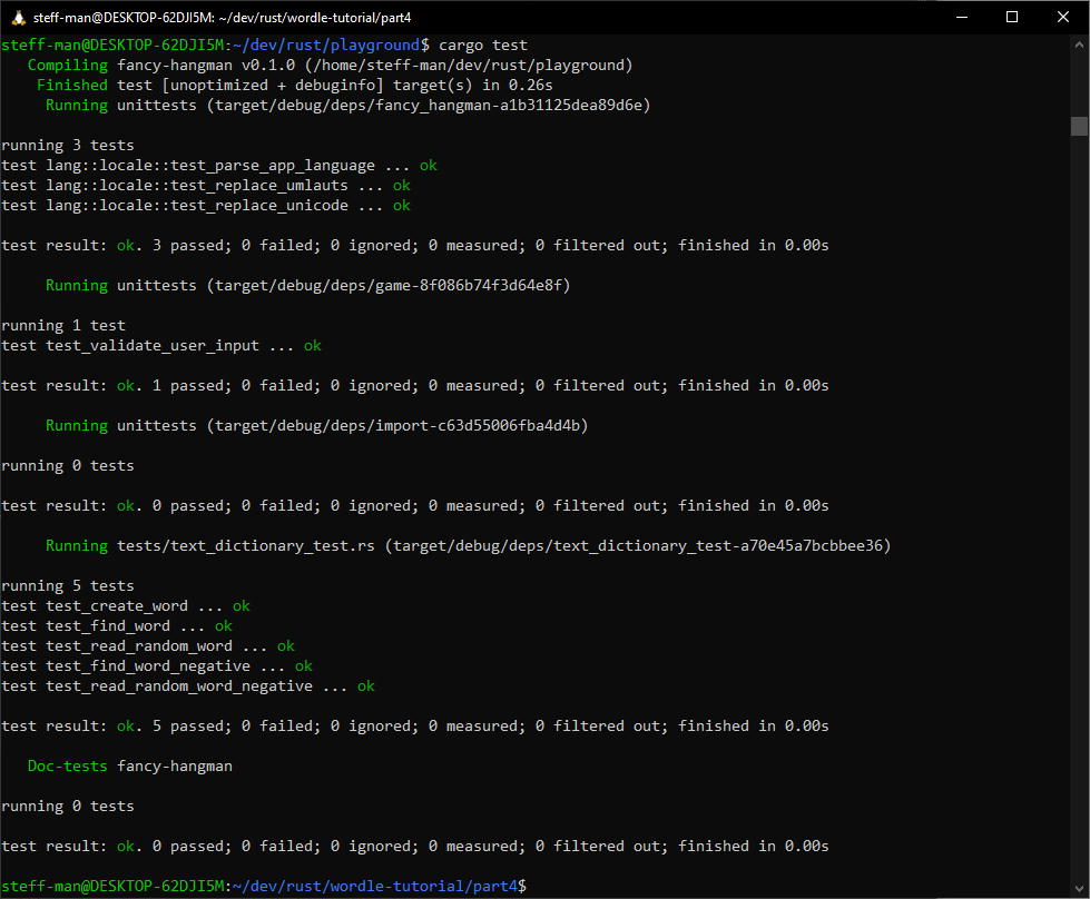 Welcome to part 4 of this Rust tutorial. Last time we insured code integrity by adding unit tests and refactored the code to have a stable foundation to build more features onto. We prepared multi-language support, added fallbacks and vastly improved the sanitization of user input. This time, there’s more action. Our game still needs an import tool and because unit testing is not enough, we’ll add an integration test with an environment based on temporary files as well. The import tool should be able to handle CLI arguments and the dictionary localization is also not finished yet.