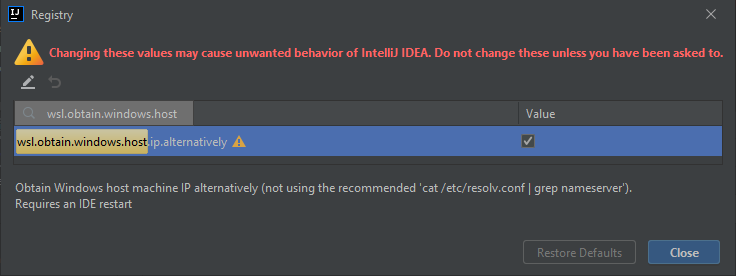 Then look if the wsl.obtain.windows.host.ip.alternatively flag is set in the IntelliJ Registry. Open the registry with