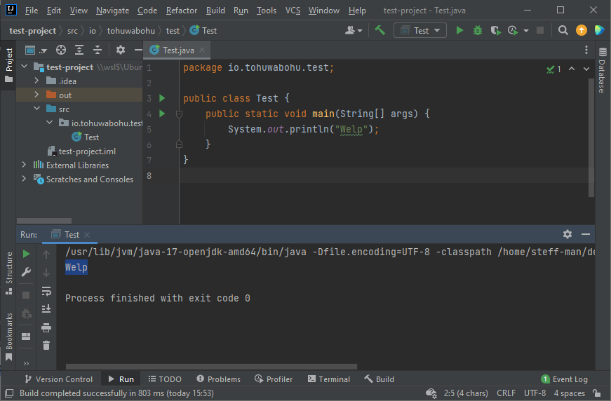 | Set up a new project with IntelliJ located in your WSL installation. |