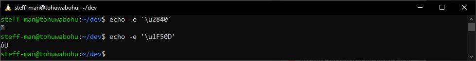 respective codepoints U+1F50D and U+2840. In both the WSL terminal and the PowerShell, I echoed those unicode