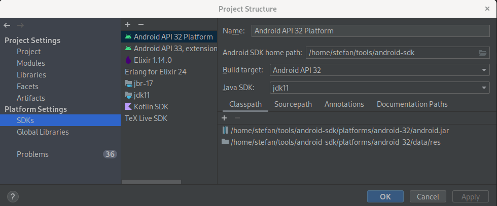 Next, point IntelliJ to a valid Android SDK Path. The SDK will be installed through the project setup, but however this manual step still will be necessary in order for the build to work. Both Android API 33 and 32 showed up as installed in the SDK Manager but apparently that did not matter.