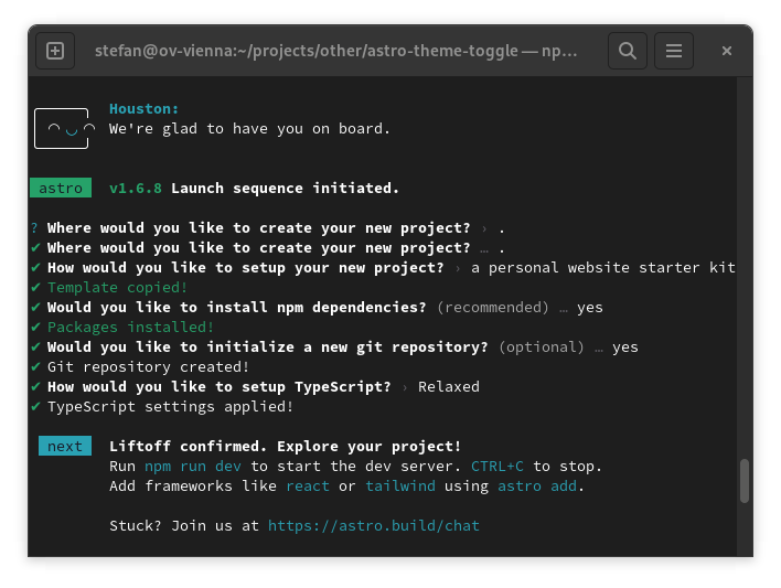 Some snippets thrown here and there are confusing. Create a new Astro project with npm create astro@latest. I chose